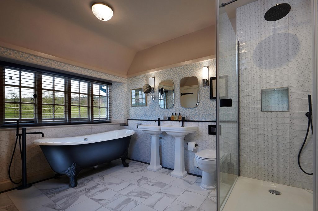 The bathrooms were completely reconfigured and spatially arranged. We mixed traditional fittings with some state-of-the-art showerheads that double up as a light. These look crisp and new and do not look out of place.